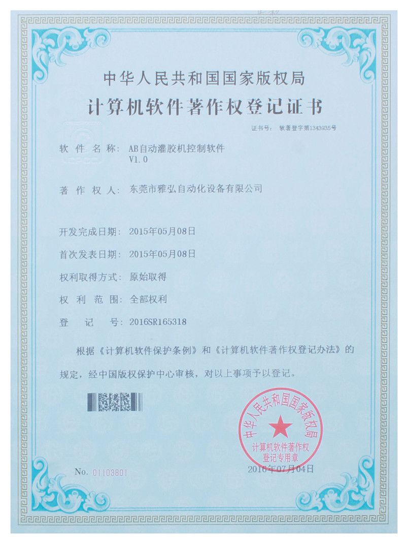 多頭圓形點膠機控制軟件證書